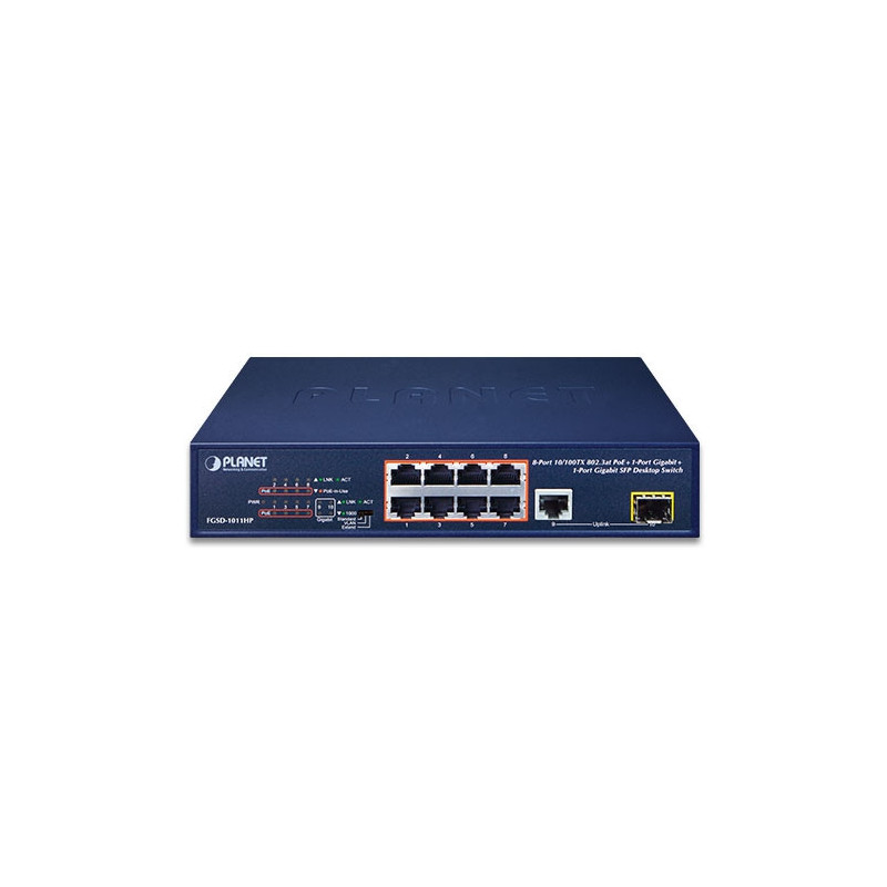 El Switch no Administrable PLANET FGSD-1011HP ofrece 8 puertos 10/100 con PoE para alimentar dispositivos, un puerto Uplink 10/100/1000 para conectividad rápida y un puerto SFP 100/1000 para conexiones de fibra óptica, ideal para entornos de escritorio y oficinas.
