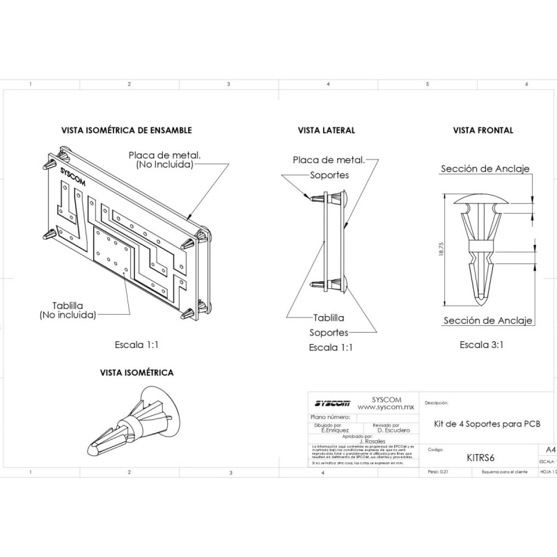 Kit de 4 soportes de plástico de SYSCOM, diseñado para fijar tablillas PCB en postes para chasis. Ideal para la organización y soporte seguro de PCB en estructuras de chasis.