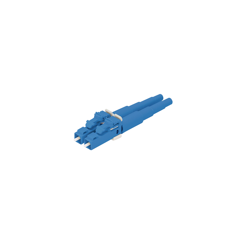 Conector óptico LC Duplex OptiCam para fibra monomodo 9/125 OS2, con acabado pre-pulido y color azul para identificación fácil, ideal para conexiones de alta precisión y baja pérdida.