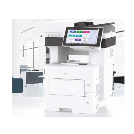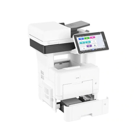La IM550F es una impresora multifuncional láser monocromática diseñada para entornos exigentes. Ofrece una velocidad de impresión de 55 ppm para tamaño A4 y 57 ppm para carta, con una resolución de 1200 x 1200 ppp. Cuenta con un panel de control inteligente de 10.1 pulgadas, 2 GB de RAM y un disco duro de 320 GB, garantizando un rendimiento eficiente. Su bandeja de papel tiene una capacidad máxima de 2.600 hojas y una salida estándar de 500 hojas. Incluye un alimentador de documentos de un solo pase (SPDF) con una bandeja adicional de 100 hojas. El paquete incluye el tóner 418477 con capacidad para 25.000 impresiones. La instalación es opcional.
