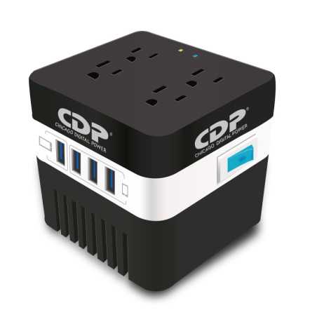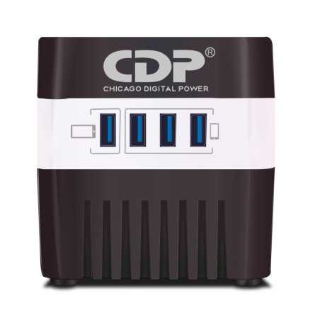 Regulador de Voltaje Monofasico CDP con capacidad de 600VA/300W, 4 tomas de corriente Nema 5-15R reguladas y 4 puertos USB de 5V x 2.1A. Protege tus dispositivos electrónicos.
