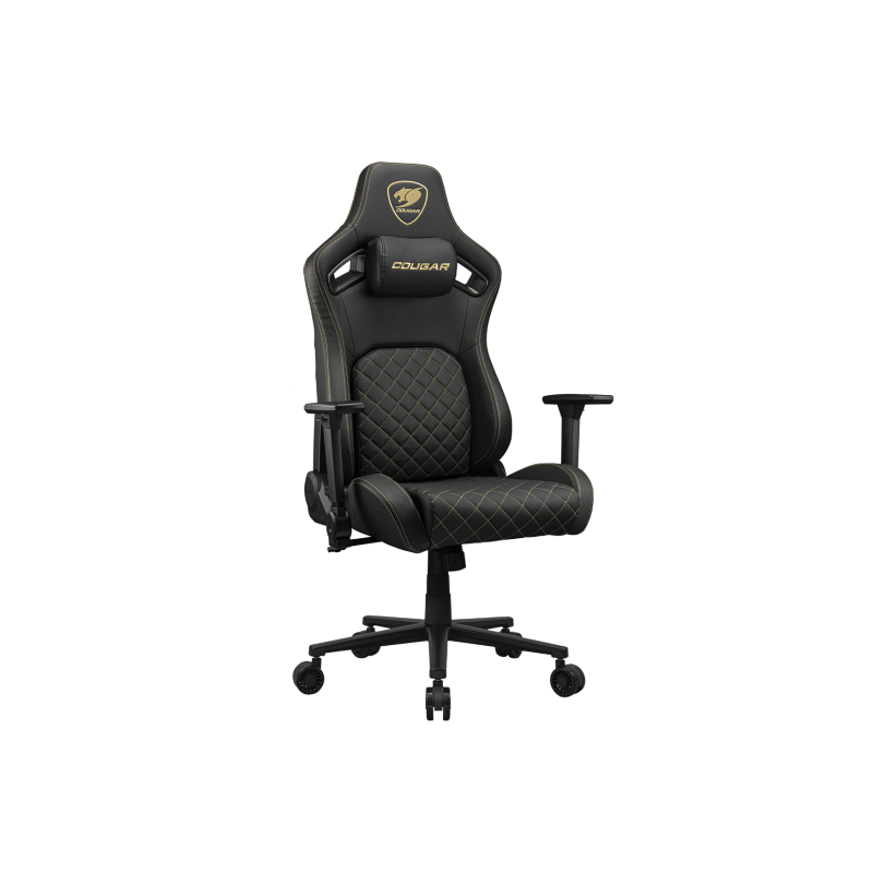 SILLA DEFENSOR NEGRO DORADO EN TELA EL SISTEMA DE SOPORTE LUMBAR AVANZADO PUSHBACK PRESERVA LA SALUD DE LA ZONA LUMBAR. LA ESPUMA MOLDEADA DE ALTA DENSIDAD Y LA ALMOHADA PARA EL CUELLO CON ESPUMA VISCOELÁSTICA MAGNÉTICA PRIORIZAN LA COMODIDAD. APOYABRAZOS PLEGABLE 4D. BOLSILLO TRASERO PARA ALMACENAMIENTO ADICIONAL, SOPORTA 120KG, RECLINA 90º HASTA 155º